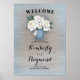 Mason jar azul-Dusty e flores brancas. Placa poster de boas-vindas.