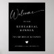 Um design minimalista preto e branco com um moderno script de Boas-Vindas em caligrafia fina e coração. Personalize facilmente as informações importantes de sua escolha na frente e as iniciais do seu monograma no verso. Um letreiro de anúncio ideal que combina bem com qualquer tema de casamento moderno.