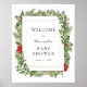 Dê as boas-vindas aos convidados para o seu chá de bebê com este lindo cartaz, apresentando uma moldura dourada rodeada por folhas perenes de inverno, poinsétia, frutos de azevinho e folhagens. Adicione o nome da convidada de honra, data do chá e texto de boas-vindas personalizado usando os campos fornecidos.