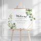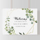 Este sinal de boas-vindas para festa de noivado em dourado geométrico verde é perfeito para uma celebração de noivado simples. O design apresenta belas folhas verdes pintadas à mão, adornando uma moldura geométrica dourada.