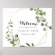 Este sinal de boas-vindas para festa de noivado geométrico dourado verde é perfeito para uma celebração de noivado simples. O design apresenta belas folhas verdes pintadas à mão, adornando uma moldura geométrica dourada.