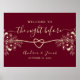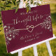 Dê as boas-vindas aos seus convidados com estilo com este elegante sinal de jantar de rehearsal com tons ricos de borgonha, sutils acentos florais dourados e um motivo de coração romântico. Perfeito para definir o tom na noite anterior ao seu casamento, este sinal personalizável adiciona um toque pessoal e sofisticado à decoração da sua celebração.