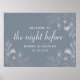 Defina o tom da sua celebração pré-casamento com este elegante sinal de boas-vindas em azul poeirado para o jantar de ensaio. Com delicados acentos florais brancos inspirados no vintage e uma tipografia clássica que combina serif e script, este design atemporal recebe maravilhosamente os convidados para “a noite anterior”. Personalize com seus nomes e data para dar um toque sofisticado e romântico ao seu evento noturno. Uma combinação perfeita para decorações de casamento em azul, cinza ou com tema floral.