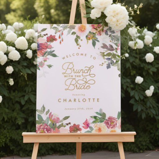 Sinal de Brunch de Chá de panela Floral Dourado, Cor-de-Rosa Elegante