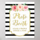Cartaz de cabine de fotos para chá de bebê, chá de noiva ou casamento em padrão clássico de listras pretas e brancas com borda dourada, flores cor-de-rosa e pêssego em aquarela e letras em estilo manuscrito. Perfeito para um chá de bebê, casamento ou chá de noiva.