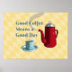 Esta poster tem um bom sinal de café do meio século com um pote de café retrorreflector com o ditado "Bom Café significa um Bom Dia". O design é um fundo de damasco amarelo, uma caneca azul cheia de café e um percolador de café vermelho vintage. O design inteiro é feito em texturas clássicas de impressão. Esta poster de parede é excelente de iluminar qualquer decoração de cozinha moderna de meio século.