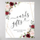 Flores com buquê de vermelho e rosa cor-de-rosa e forma geométrica dourada emoldurando o script "cartões & presentes" e tipografia clássica para sinal de casamento.
