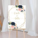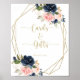 Este letreiro de cartões e presentes geométricos dourados florais é perfeito para um casamento rústico ou chá de noiva. O design simples e elegante apresenta uma tipografia clássica e sofisticada em dourado. O design apresenta lindas flores escuras azuis, azuis, azul-marinho, rosa, rosadas, douradas e folhagens verdes pintadas à mão, adornando uma moldura geométrica.