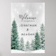 Um belo sinal de boas-vindas de design de inverno/feriado/natal para o seu casamento, chá, festa etc com árvores de abeto e um pano de fundo de neve, e lanternas bonito. Perfeito para as suas comemorações sazonais! Itens correspondentes disponíveis em nosso compro.