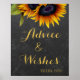 O conselho e a placa de casamento de desejos com um belo buquê de girassóis num fundo de calçados de cinza escura. Perfeito para um casamento elegante no verão ou outono.