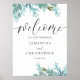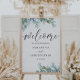Linda placa de casamento rustica de eucalipto para seu dia especial. Apresentando uma folhagem elegante de aquarela em verde de sábado sobre fundo branco. A caligrafia de boas-vindas está em uma fonte legal escrita à mão. Fácil de editar com suas informações exclusivas.