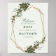 Um design floral com uma estrutura geométrica moderna e flores brancas com folhagem verde. O texto e as cores desta poster de sinal de casamento podem ser editados.