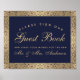 Um letreiro de casamento alfabético vintage e elegante, recomendado para um casamento com cores de casamento azul-marinho e dourado. O fundo é azul-marinho. Tem bordas douradas florais com decorações intricadas de rosas silvestres. Todo o texto é dourado. As palavras Livro de Visitas e os nomes são escritos em uma fonte caligráfica elegante, o restante em maiúsculas. A mensagem "por favor assine nosso" está arqueada acima das palavras "Livro de Visitas".