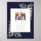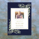 Uma elegante celebração da vida, sinal de serviço funerário memorial com folhagem botânica em aquarela sobre um fundo azul marinho. Criado por Thisisnotme©