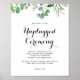 Este sinal de cerimônia desplugada de eucalipto verde é perfeito para um casamento ou chá de panela rústico. O design apresenta lindas folhas verdes de eucalipto, pintadas à mão, reunidas em buquês elegantes para embelezar seu evento.