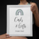 Este charmoso sinal de chá de fraldas apresenta um delicioso tema do arco-íris em matizes macios, perfeito para celebrar seu pequeno milagre. A design inclui gráficos de arco-íris lúdicos com sotaques azuis claros, associados a tipografia moderna e elegante. A frase "Cartões e presentes" é exibida de forma destacada, fazer que os hóspedes possam saber onde deixar suas ofertas pensativas. Esta placa adiciona um toque alegre e acolhedor à decoração do seu chá de fraldas, misturando-se perfeitamente com celebrações do arco-íris ou do tema do bebê.
