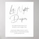 Configure uma atividade de fralda noturna tardia ou uma estação de jogos com este sinal 8x10 disponível através de download digital ou impresso profissionalmente. O sinal de Fralda da Noite Tardia contém letras suaves fora de preto em um fundo branco com uma breve descrição do conceito (os convidados usam um marcador para escrever mensagens engraçadas ou encorajadoras em fraldas descartáveis). O texto pode ser personalizado para atender às suas necessidades ou ao tema do evento.