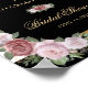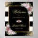 Elegante sinal de boas-vindas de chá de panela floral preto e dourado, com flores cor-de-rosa pinceladas e verde, detalhando os detalhes do evento dentro a um quadro dourado adornado com confete dourado contra um fundo listrado preto e branco. Itens correspondentes disponíveis.