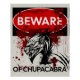 Sinal divertido "Cuidado com Chupacabra" com uma criatura Chupacabra, sangue e marcas de garra.