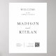 Esta elegante placa de poster de boas-vindas do casamento apresenta uma design minimalista com linhas limpas e uma estética moderna. O texto é centrado e enquadrado com uma fina borda preta, fornecendo um aspecto polido e sofisticado. O poster dá calorosamente boas-vindas aos convidados para a cerimônia de casamento e destaca os nomes dos casais em negrito, na moda, criando um ponto focal impressionante. Na parte inferior, a placa inclui a data do casamento e a localização em uma fonte pequena e refinada. Além disso, há um código QR na parte inferior direita, convidando convidados a digitalizar e ver o programa de casamento digitalmente, adicionando um toque contemporâneo ao design clássico. O layout geral é elegante, simples e eficaz, perfeito para um casamento moderno.