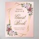Este elegante sinal floral de pincel e ouro com um quadro geométrico adornado com rosas cor-de-rosa pinceladas e verde convida os convidados de casamento a assinarem o seu livro de convidados. Itens correspondentes disponíveis. Personalizar facilmente online.