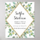 Esta placa de selfie de caligrafia geométrica dourada é perfeita para um casamento ou chá de panela rústico. O design apresenta ramificações botânicas verdes, desenhadas à mão, de eucalipto e folhas adornando uma elegante estrutura geométrica. Personalize a placa com a hashtag de casamento.