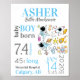 O sinal de estatísticas de nascimento do bebê Espaço Azul inclui todas as informações de nascimento, incluindo data, hora de nascimento, peso e local de nascimento. Inclui astronautas e foguetes espaciais ilustrados.