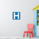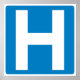 Um sinal de aviso de estrada e autoestrada de estilo internacional aconselhando um hospital próximo.
