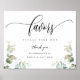 Elegante sinal de favor de casamento com detalhes elegantes de cor aquática verde e detalhes modernos de caligrafia escrita à mão. O Eucalipto verde sai numa bela mistura de matizes verdes, azuis e beges. 10" x 8" é apenas o nosso tamanho predefinido, sinal disponível numa variedade de tamanhos. Fácil de enquadrar ou, em alternativa, colar/grampear em MDF barato. Design da nossa coleção "Elegante Verde Eucalyptus Wedding and Events" com uma variedade de produtos coordenadores disponíveis.