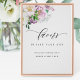 Elegante sinal de favor de casamento com detalhes florais requintados de cor d'água e caligrafia escrita à mão graciosa e moderna. 8" x 10" é apenas o nosso tamanho predefinido, sinal disponível numa variedade de tamanhos. Detalhe floral em uma bela mistura de tons púrpura, lavanda, lilás, rosa, creme de pêssego e pasta branca. Fácil de enquadrar ou, em alternativa, colar/grampear em MDF barato. Design parte da nossa coleção "Pastel Floral Alegre" e das nossas coleções "Purple and Pink Joyful Floral", ambas com uma variedade de produtos coordenadores disponíveis.