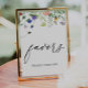 Sinal de favores com uma ilustração de flores silvestres, folhagens e abelhas zumbindo com a palavra "favores" em um script de caligrafia divertido.