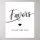 Design simplesmente elegante em letras de topografia em roteiro preto e fundo branco e letras pretas. Pequeno coração no meio. Sinal de FAVORES de casamento ou chá de noiva para qualquer época do ano ou tema. Coloque o sinal na mesa onde os favores dos convidados podem levar um na entrada ou quando saírem