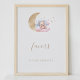 Este sinal de chá de fraldas bonitinho apresenta uma ilustração aquosa de um urso bebê sentado numa nuvem rosa e azul com lua dourada e cercado por estrelas. Personalize-o com seus detalhes e utilize as ferramentas de edição para obter outros ajustes, como tamanho da fonte, posicionamento e cor.