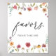 Sinal de favores com uma ilustração de flores silvestres com a palavra "favors" em um script de caligrafia divertido.