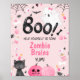 Sinal de Festa de aniversário do Dia das Bruxas de Garota Negra Rosa Boo Sinal de festa de aniversário de aniversário de Halloween de uma bela aquarela em preto e rosa. Este design apresenta um pequeno fantasma com um arco cor-de-rosa, abóboras de gato preto e rosa e vários outros itens em um fundo cor-de-rosa. Uma doce adição ao tema do Dia das Bruxas de uma garotinha, festa de aniversário de outubro.