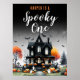 Sinal de Festa de Um primeiro aniversario. Bem-vindos aos seus hóspedes em estilo com este cartaz festivo e divertido, perfeito para o primeiro aniversário de um menino ou de uma menina. No topo, a frase "Name Is A Spooky One" é exibida em uma mistura de scripts lúdicos e fontes simples. O centro apresenta uma casa assombrada a preto e branco, realçada com abóboras laranja, jardineiras-de-jack e árvores assustadoras, com fantasmas brancos e morcegos para mais charme. Ideal para cumprimentar convidados e dar uma vibração festiva de aniversário de Halloween. Disponível em uma versão de impressão ou você pode comprar como um arquivo digital baixável para o impressão em casa ou localmente.