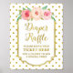 poster de sinal de rifa de fralda para chá de fraldas em padrões de pontos brancos e dourados com borda dourada, flores rosadas rústicas e cor d'água de pêssego e letras de estilo manuscrito.