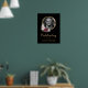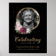 Sinal de boas-vindas de funeral floral preto e dourado elegante e personalizado com uma moldura de foto dourada com flores vermelhas burgundy e rosadas em um fundo de carvão escuro. Para pedidos personalizados, por favor envie-nos uma mensagem via chat do Zazzle.