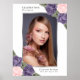 Elegante sinal de boas-vindas de celebração de vida/funeral com foto floral roxa e rosa, apresentando rosas roxas e rosadas e flores de respiração de bebê decorando uma foto dentro de uma moldura prateada. Itens correspondentes disponíveis.