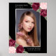 Elegante sinal de boas-vindas de celebração da vida/funeral em aquarela preta e prateada com moldura de foto prateada adornada com rosas vermelhas burgundy e rosas e flores de respiro de bebê. Itens correspondentes disponíveis.