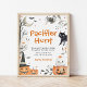 Poster de Sinal de Caça de Caça com Pacificador do Chá de fraldas de Halloween. Um Pequeno Boo Está Quase Devido Ao Tema Ghost Pumpkin Do Halloween Um Chá de fraldas Bonito Adivinha Quem Mãe Ou Jogo De Pai. As únicas abóboras de Halloween e fantasmas bonitos são lindas para o Halloween assustador e chás de fraldas de boho. Sinal de jogo editável para primavera, verão, outono (outono) e chás de fraldas de inverno.