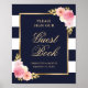 Este sinal floral listrado de azul e branco elegante convida os convidados do casamento a assinar o seu livro de visitas. Itens correspondentes disponíveis para complementar este sinal de livro de visitas de casamento com flores rosa e folhagens douradas.