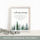 Projetado para combinar com nossa coleção de casamento Timber Grove, este sinal elegante de inverno florestal é perfeito para colocar em uma mesa de memória ou exibição em homenagem aos entes queridos que faleceram. Personalize o cabeçalho e o texto do corpo (mostrado com "Em Memória Amorosa" e um breve poema), acentuado com uma borda inferior de pinheiros em tons de caçador e verde floresta em aquarela.