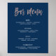 LEAH • Este sinal de menu de bar azul naval e dourado rosa é perfeito para casamentos românticos e elegantes. A paixão é trazida pela fonte de letra manuscrita fofa em textura de folha de “faux” dourado rosa enquanto o fundo azul naval estiloso combinado com o texto branco adiciona um toque de preciosidade. Esta coleção coordena bem com celebrações glamorosas, especialmente para eventos internos, outono ou inverno.