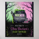 Bem-vindos aos seus hóspedes a uma comemoração feia assustadora com este sinal de chá de fraldas de cor-de-água rosa e verde! A design apresenta um quadro de árvore assustadora ramifica ao redor de um caldeirão com um chapéu de bruxa e vassoura. O perfeito para um chá de fraldas de outubro fofo ou para a celebração do chá de fraldas de Halloween com vibes de bruxas modernas.