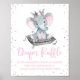 Sinal de mesa de rifa de fraldas para chá de bebê de elefante menina com adorável princesa bebê elefante em um fundo de brilho prateado. Este sinal de mesa de rifa de fraldas para chá de bebê de elefante menina pode ser colocado em uma moldura de 8x10 polegadas e colocado na mesa.