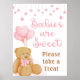 Poster de Mesa, cor-de-rosa-branca, do deserto, apresentando um urso de pelúcia com arco cor-de-água, balões de coração cor rosa e cor-de-rosa, e uma terra cintilante rosa-falsa com o ditado BABIES ARE SWEET - POR FAVOR, TOME UM TRATADO. OPÇÕES: O design é mostrado no tamanho de 18x24 pol em Papel de Matriz de Valor — outros tamanhos e opções de papel ou uma opção de arquivo de download digital para impressão local estão disponíveis na página de pedidos. O design também pode ser transferido para um conselho de espuma, uma tenda de mesa, um sinal de papel, etc. ASSISTÊNCIA: Para obter ajuda com a modificação ou personalização do design, alteração de cor, redimensionamento ou transferência do design para outro produto ou conversão para um arquivo de download digital, entre em contato com o designer ANTES DE ENCOMENDAR através da guia MENSAGEM de bate-papo Zazzle abaixo ou envie um email para makeitaboutyoustore@gmail.com.