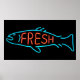 Uma fotografia legal de um sinal de neon de peixe fresco num fundo preto. Copyright © 2009 Karin Hildebrand Lau.