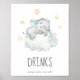 Este pequeno sinal de chá de fraldas de elefante é perfeito para um evento ou festa simples. O design moderno apresenta um animal de safari, moderno e agudo, que dorme numa nuvem macia com estrelas amarelas cintilantes.