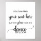 Este simples cartaz preto de dança é perfeito para um casamento rústico ou moderno. A design minimalista apresenta uma elegante letra de escrita de pincel e um adorável coração feminino. O cartaz diz "você pode encontrar seu lugar aqui, mas seu lugar está no chão da dança". Enquadre este sinal e coloque-o na mesa de recepção com os cartões de lugar.